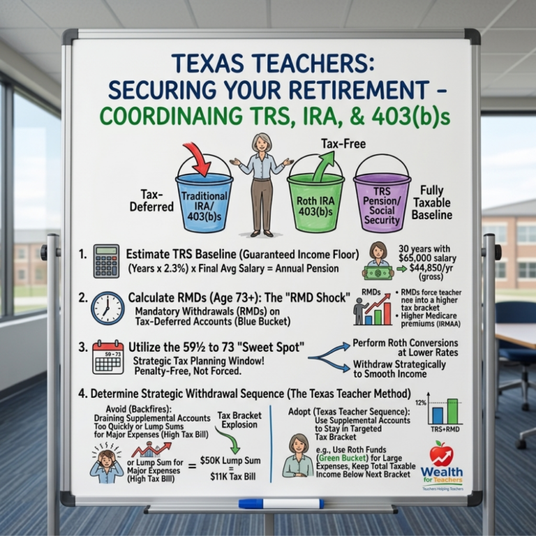 Texas teachers who successfully coordinate TRS and IRA strategies follow specific withdrawal sequences that minimize taxes while maximizing income longevity. Those who don’t often discover their mistakes when it’s too late to fix them. This comprehensive Texas Teacher Retirement Planning Guide will show you how to align all your retirement accounts correctly.