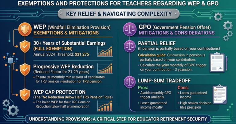 Some teachers also explore strategies like taking lump-sum distributions from TRS to avoid the monthly pension that triggers GPO, though this approach has significant tradeoffs.